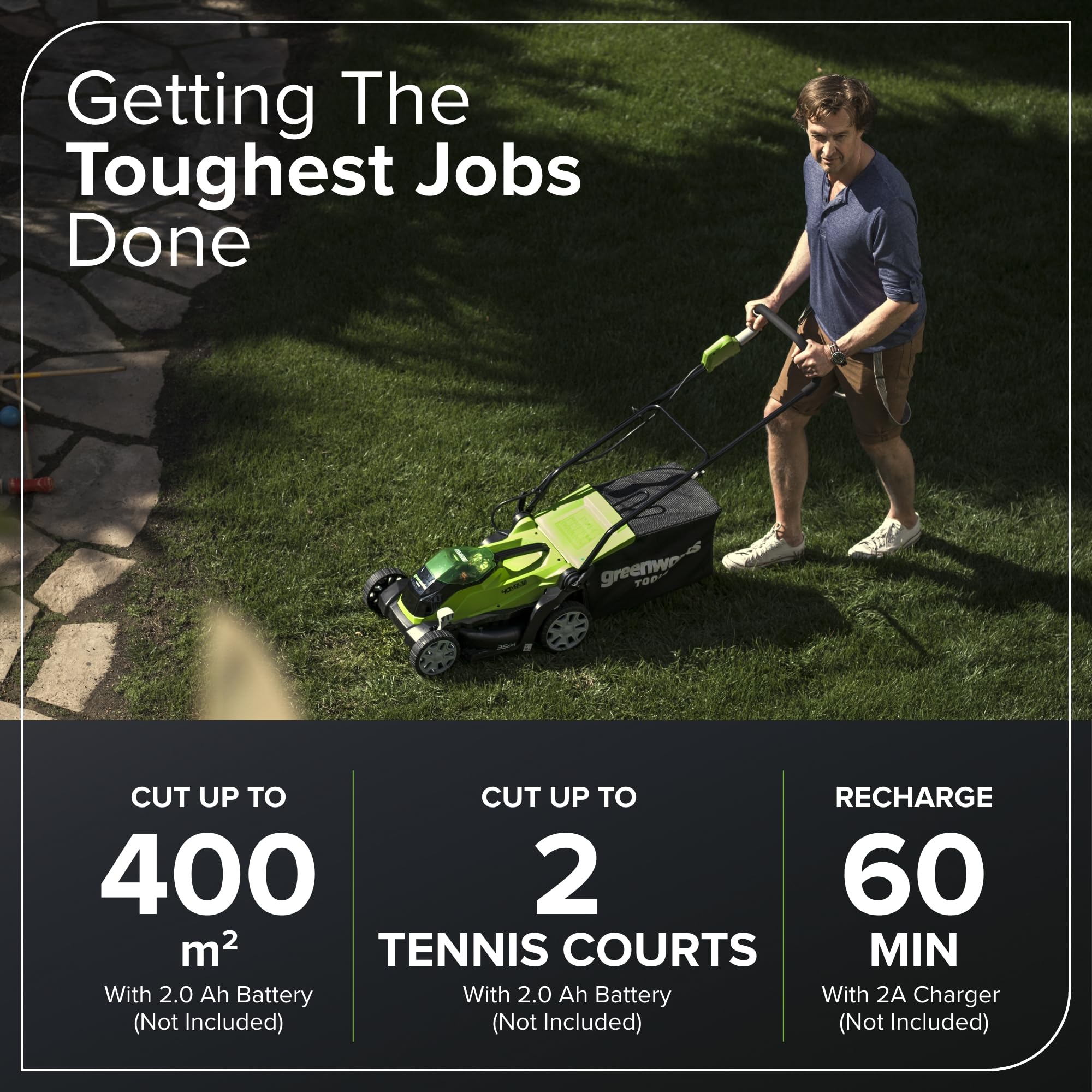 Ideal for homeowners with medium-sized lawns (up to 400m²) who prefer a lightweight, cordless mower. It's perfect for those already invested in the Greenworks battery ecosystem. However, it may not suit larger gardens or those seeking heavy-duty performance.