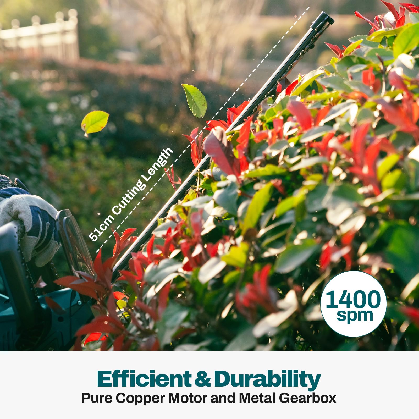 Terratek Cordless Hedge Trimmer 20V 1HR Fast Charge 51cm (510mm) Cutting Length, Hedge Trimmer Cordless Hedge Cutter with 2x Batteries and Charger Included