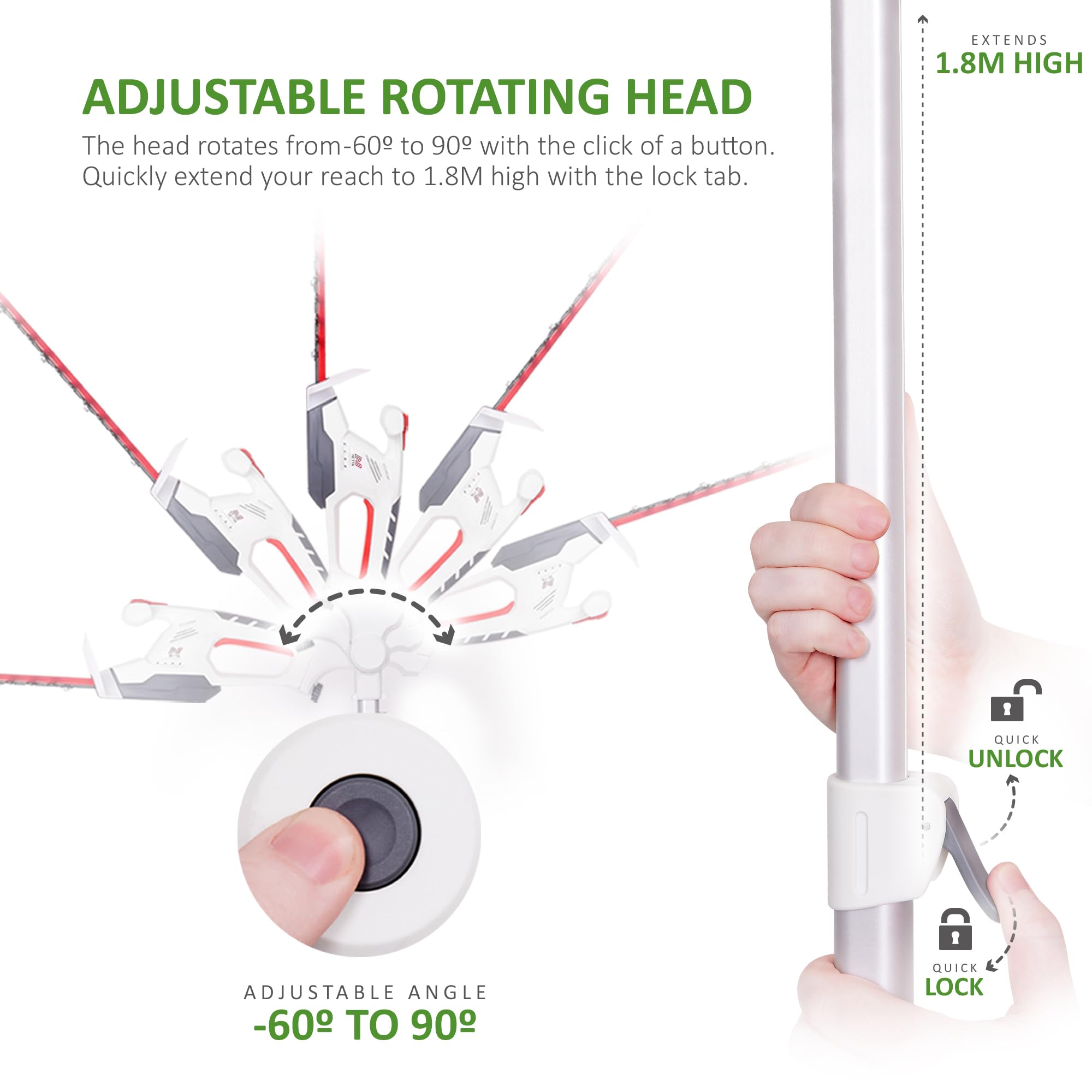 - The adjustable head from -60° to 90° makes it easier to cut hedge tops, sides, and awkward angles.