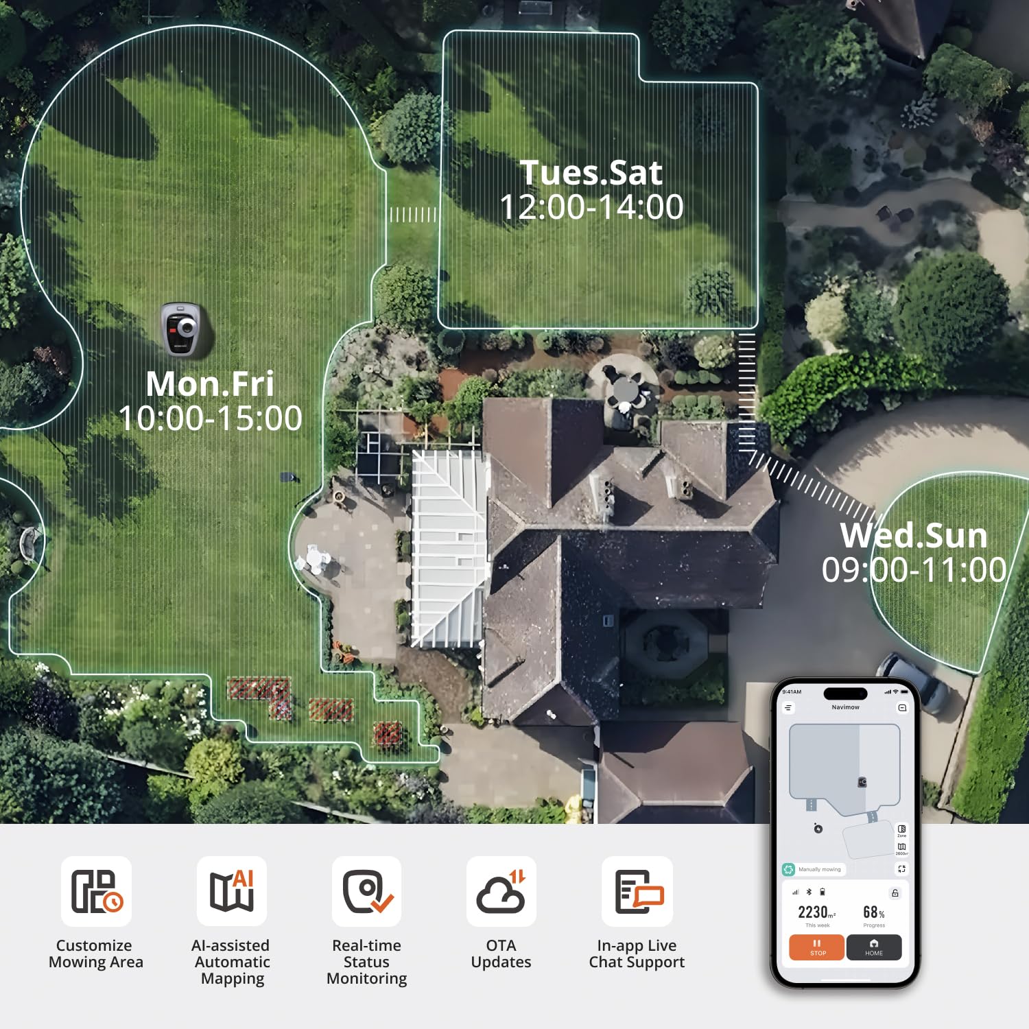 - Multi-Zone Management: Custom schedules and mowing maps can be created via the app, ideal for complex garden layouts.