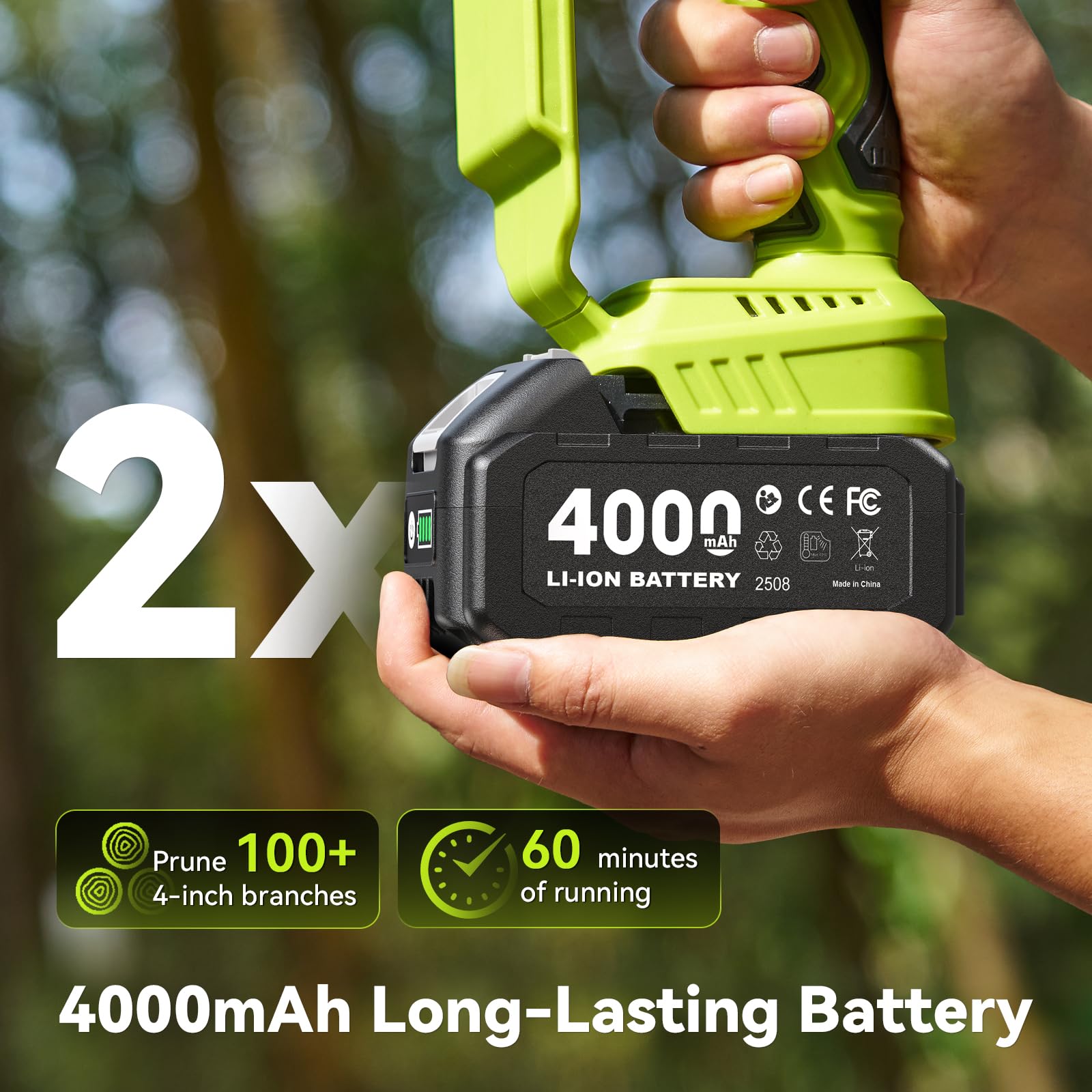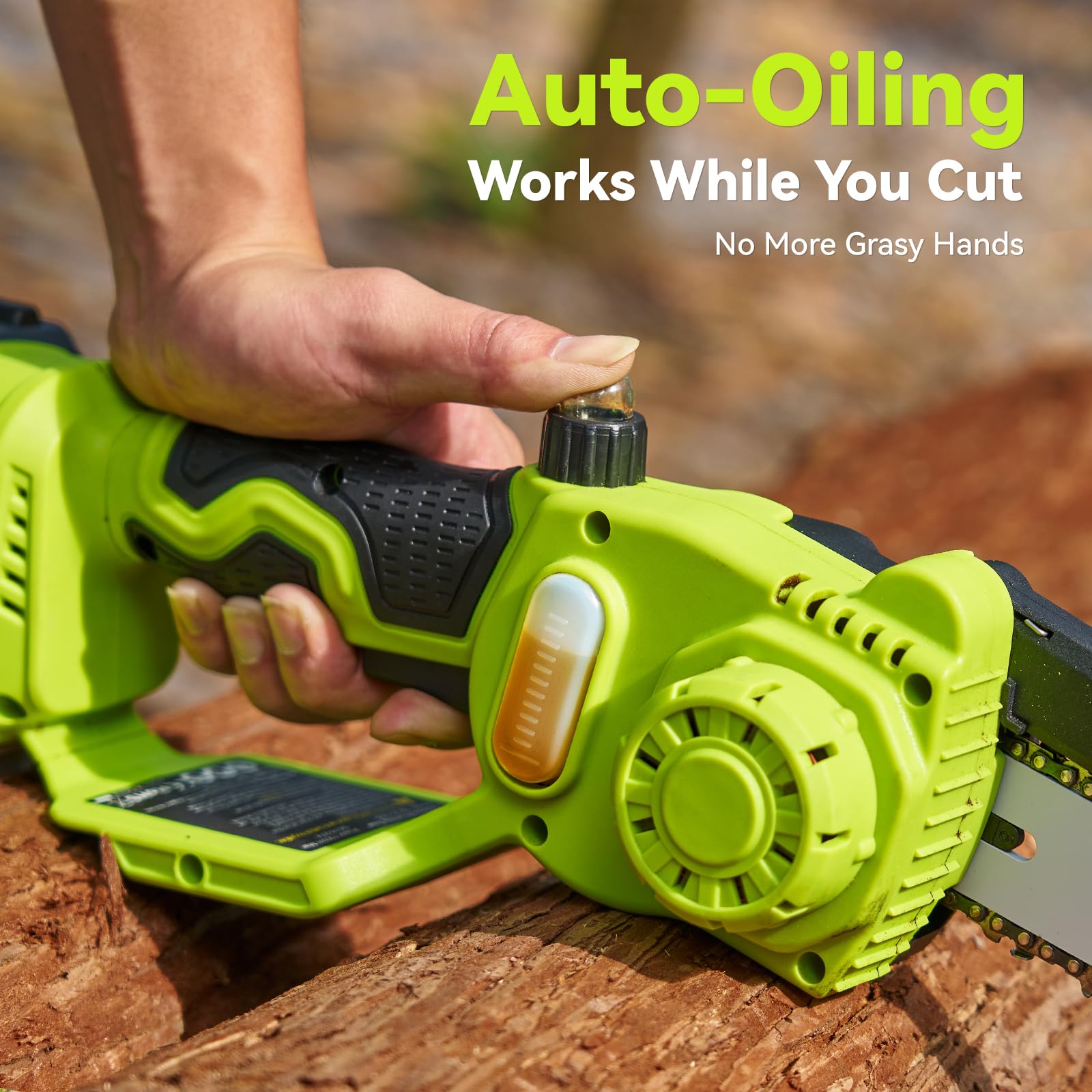 Included with the chainsaw are two 4000mAh lithium-ion batteries, providing a total capacity of 8000mAh. This is a substantial advantage for longer cutting sessions, as users can easily replace one battery while the other charges. The integrated chain lubrication system enhances the tool's maintenance ease, ensuring smooth operation over time.