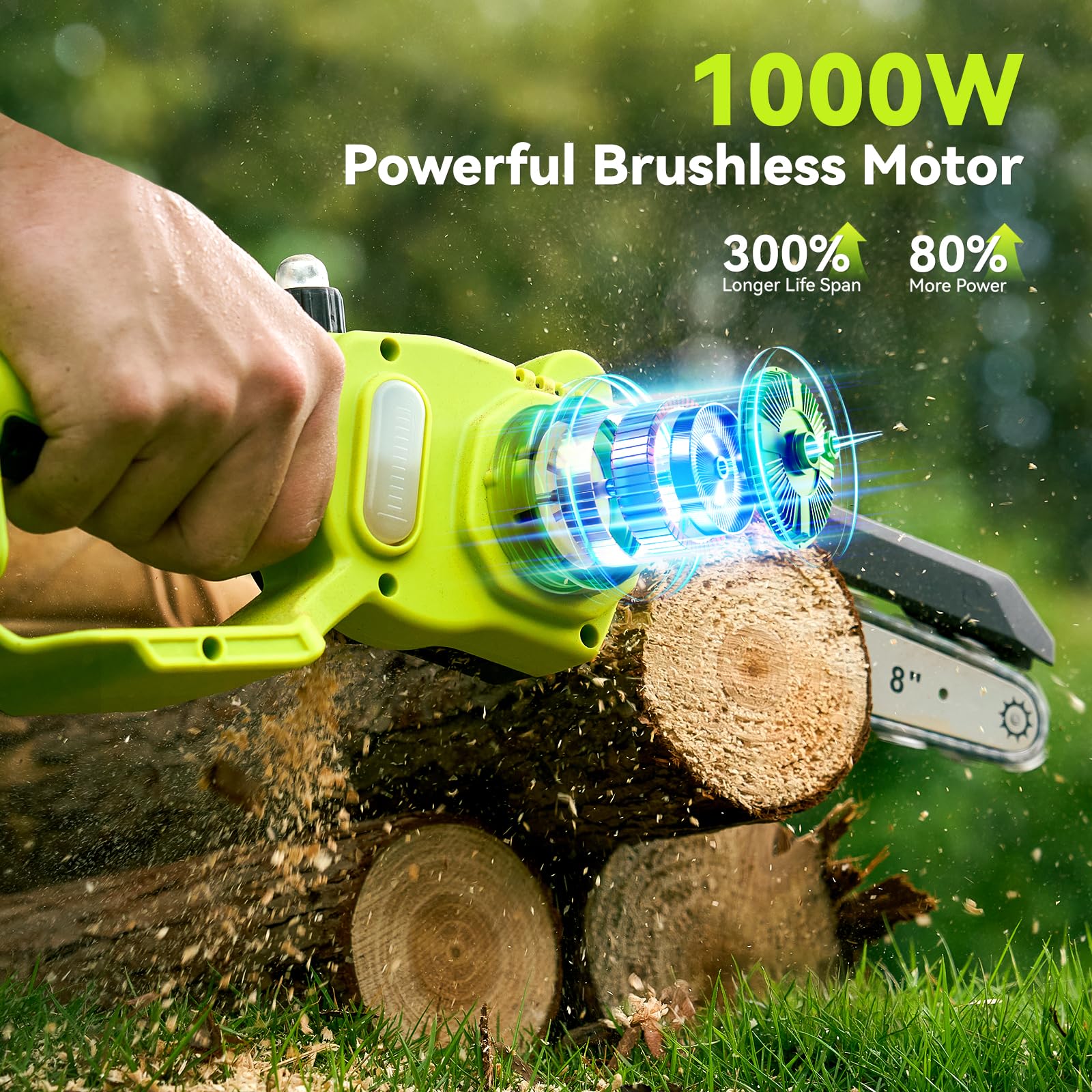 vs SEESII 8 Inch Mini Cordless Chainsaw with High Capacity 4000mAh x2 Batteries, 900W Powerful Electric Chain Saws with Oiler System, Handheld Battery Powered Saw for Tree Trimming Pruning