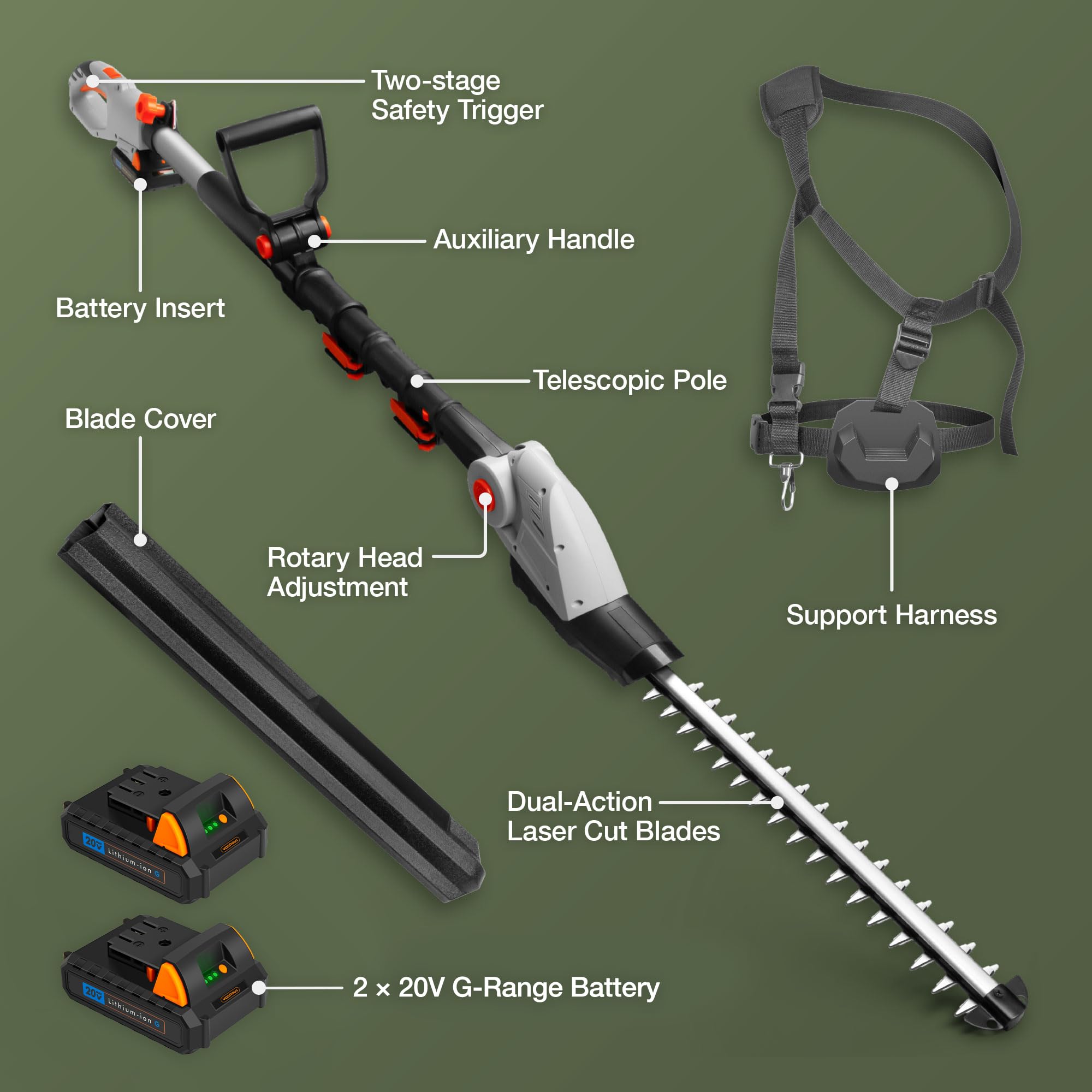 VonHaus Pole Hedge Trimmer Cordless – Long Reach Telescopic Extendable Cutter for Hedges, Bushes, Branches, Shrubs – 20V Battery, Charger, Harness, 135° Adjustable Head, Dual Action Blades