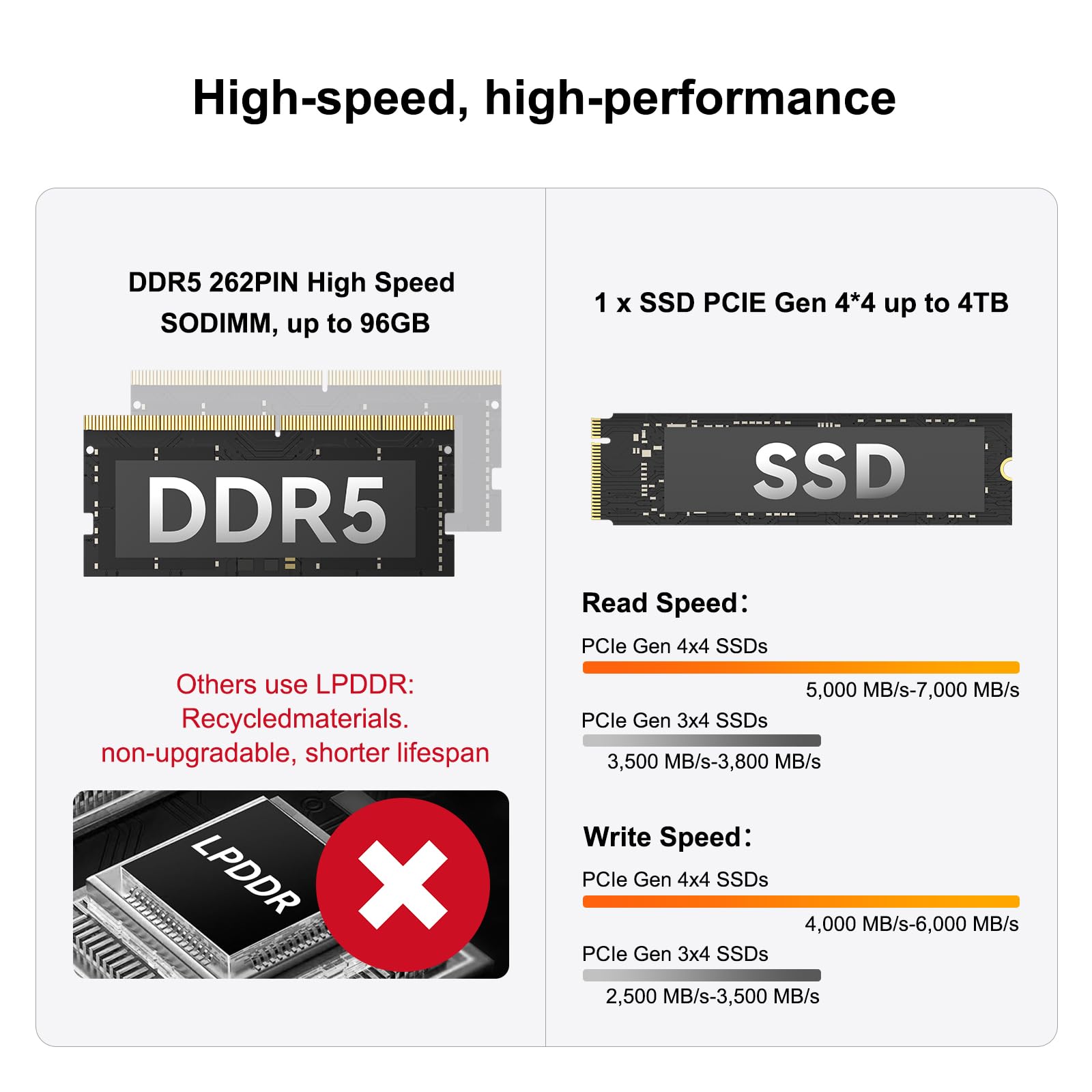 - 16GB DDR5 RAM, expandable up to 96GB, ensures longevity and capability for multitasking.