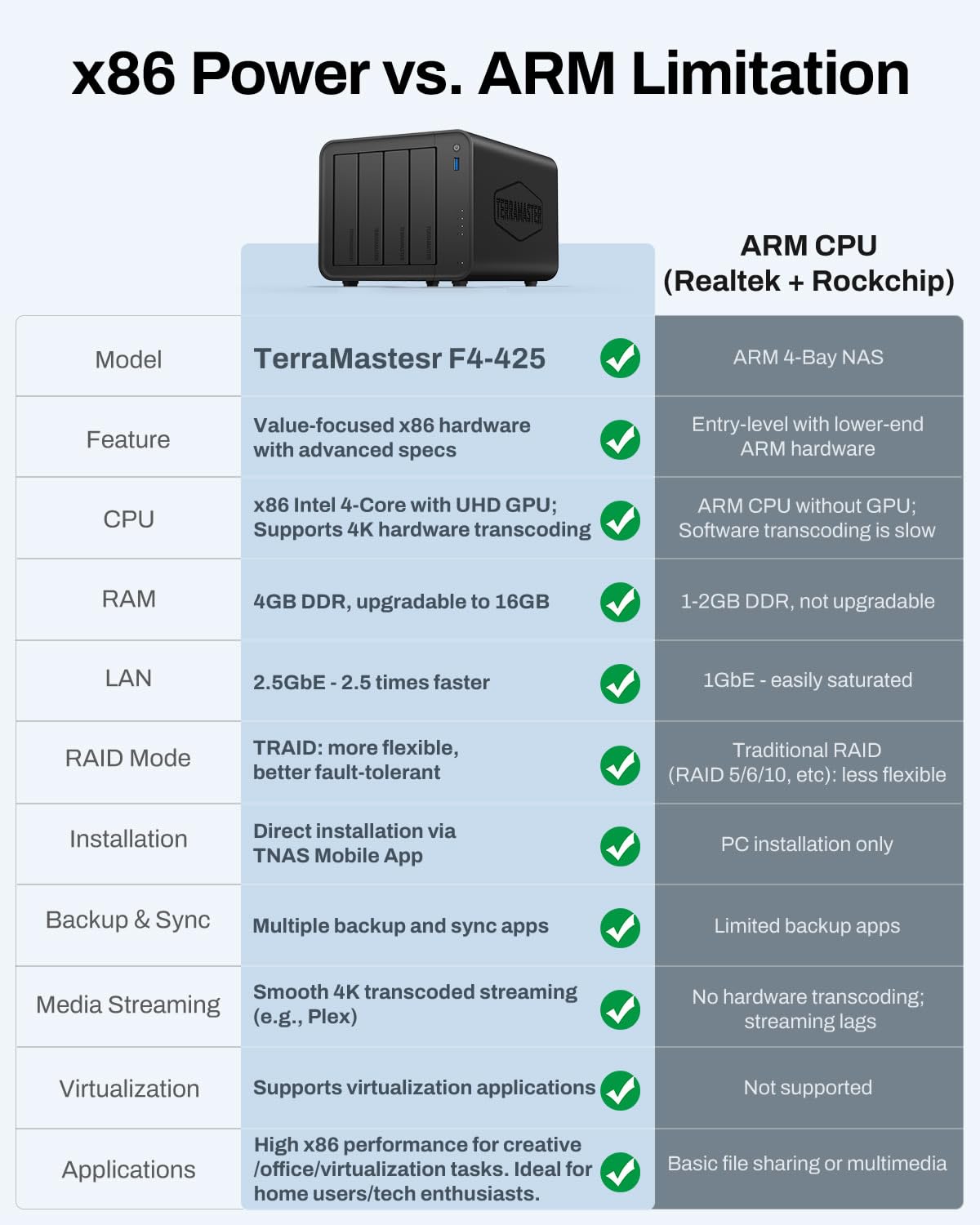The TERRAMASTER F4-425 4-Bay NAS is an excellent investment for home users seeking a capable multimedia server. Its combination of powerful hardware, user-friendly management via the TNAS Mobile app, and substantial storage capacity makes it a strong contender in the NAS market. However, potential buyers should be aware of the lack of hot-swappable bays, which could complicate maintenance. For those prioritizing multimedia capabilities and a robust performance at a reasonable price, the F4-425 is certainly worth considering.
