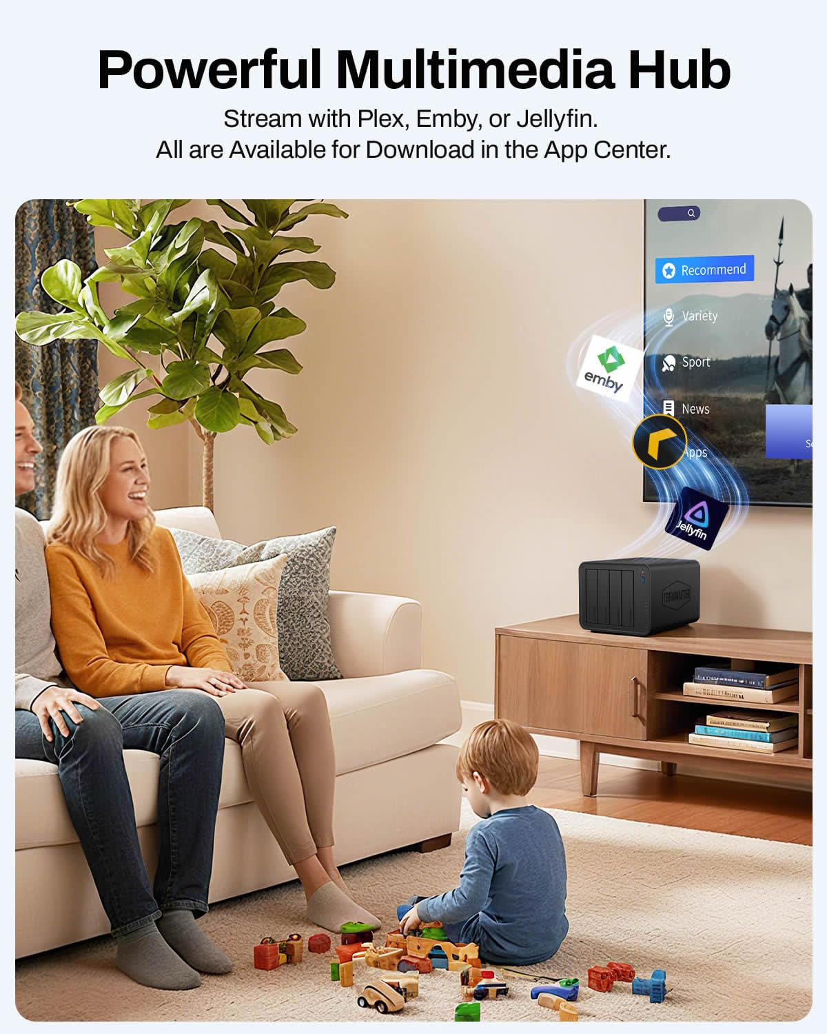 - 4-bay design allows for up to 120TB of storage, catering to large media libraries.