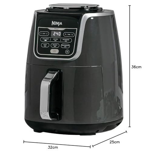 The Ninja Air Fryer MAX presents a sleek design in grey and black, which will fit seamlessly into your kitchen aesthetic. Its dimensions (H36cm x W25cm x D32cm) make it compact enough for most UK worktops, ensuring it won’t hog valuable space. The digital interface is user-friendly, making it easy for anyone to pick up and start cooking.