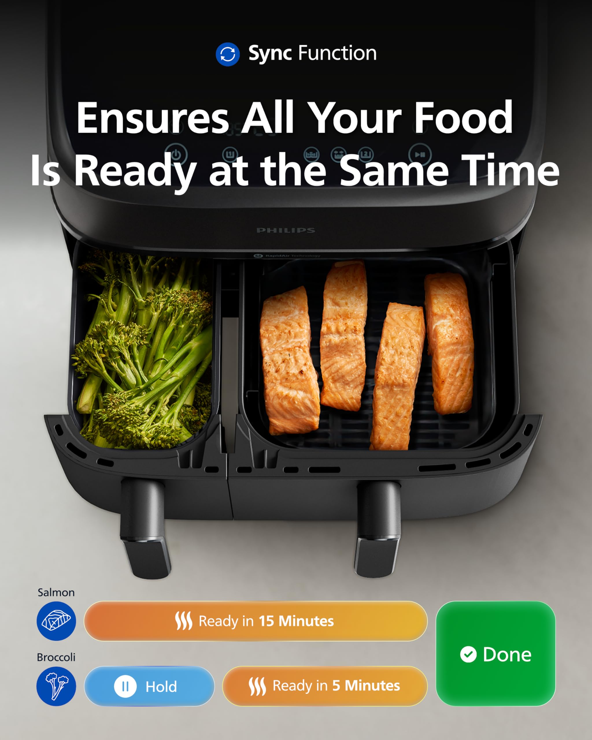 - Uses RapidAir Plus Technology for evenly cooked food with up to 90% less fat.