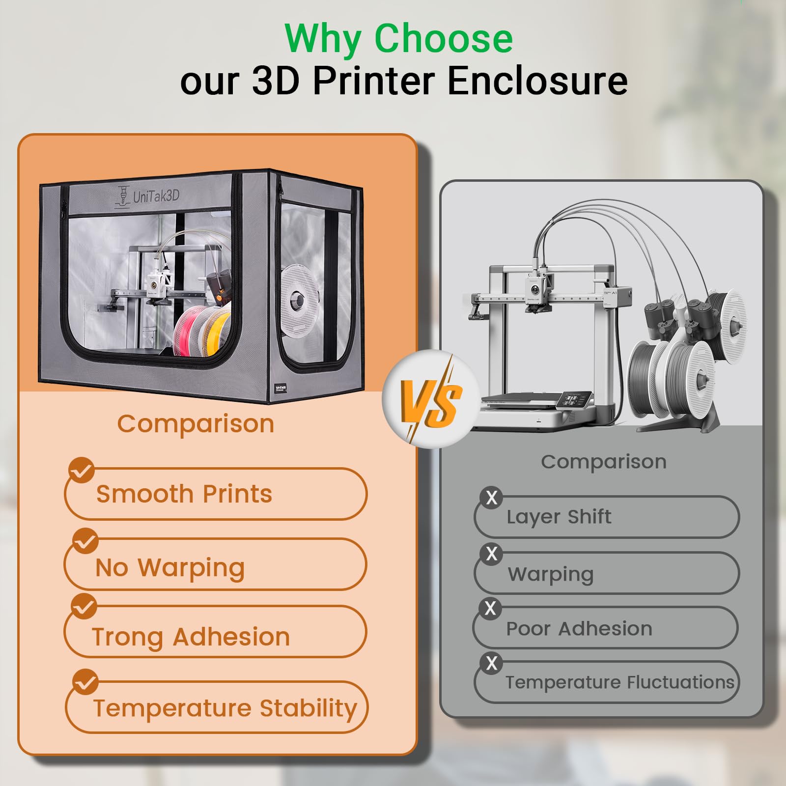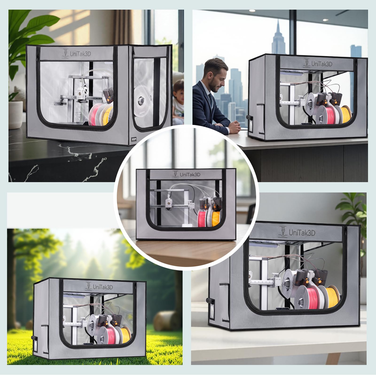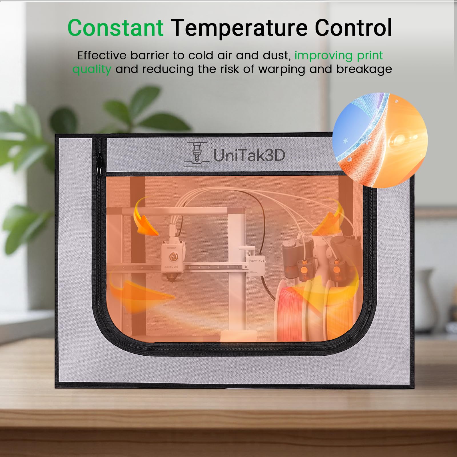 UniTak3D lists five core benefits: dustproof and fireproof materials, a stable structure, LED light illumination, and constant temperature control. Those are the features buyers usually want from an enclosure, and they’re all practical rather than gimmicky. Dust protection helps keep the printer and workspace cleaner, while the fire-resistant material claim is reassuring for anyone who prints for long periods. The constant temperature angle is also important, since a steadier chamber environment can reduce warping and improve print quality, especially on larger or more temperature-sensitive jobs.
