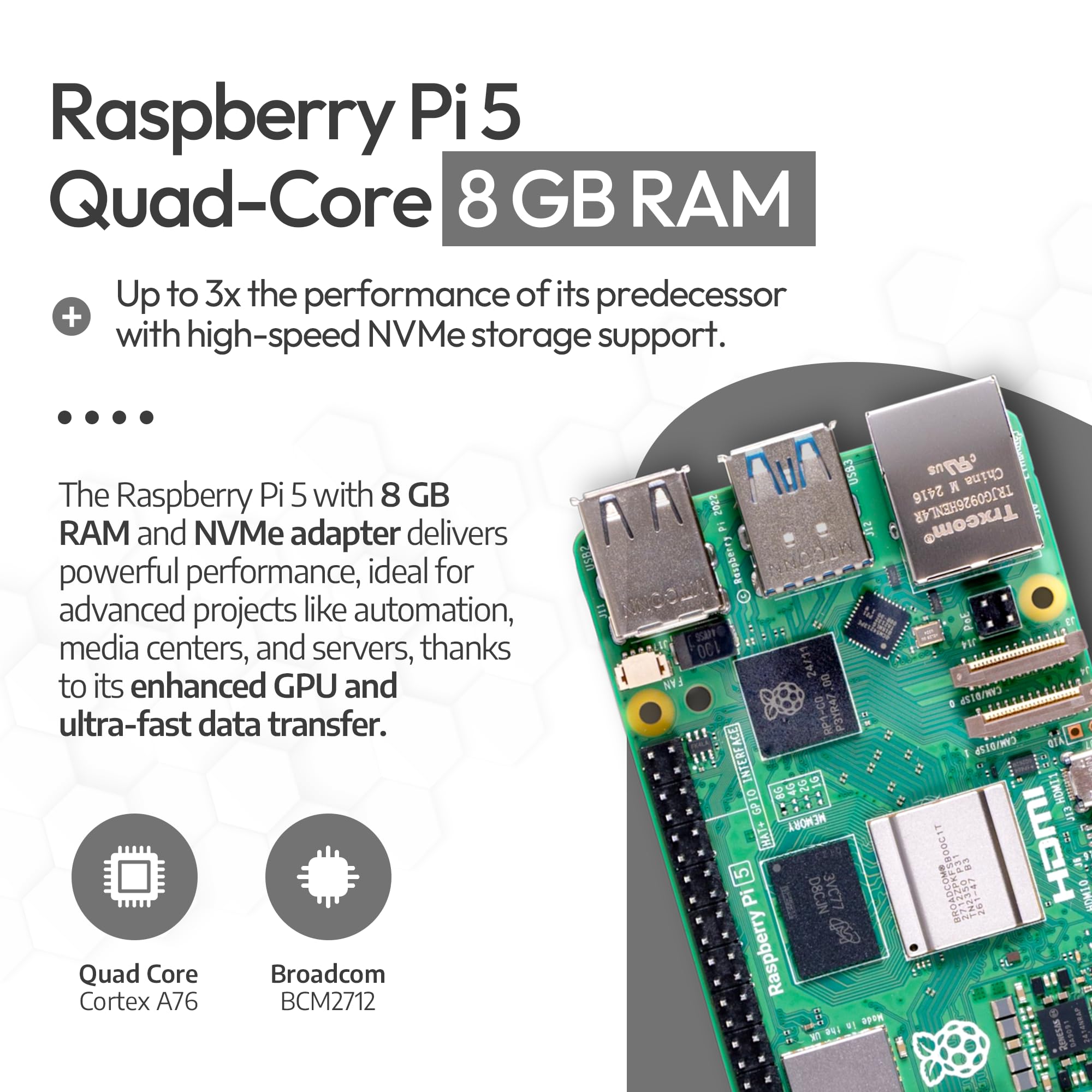 This kit is built around a Raspberry Pi 5 with 8GB of RAM, which is the main reason to consider it. That memory level is useful for heavier workloads like Home Assistant, smart home hubs, retro gaming, and mini PC use, where the extra headroom matters more than on basic Pi projects. The bundle also includes a PCIe to M.2 NVMe board, which is a major upgrade over microSD-only setups because NVMe storage is designed for faster data transfer and a more responsive system.