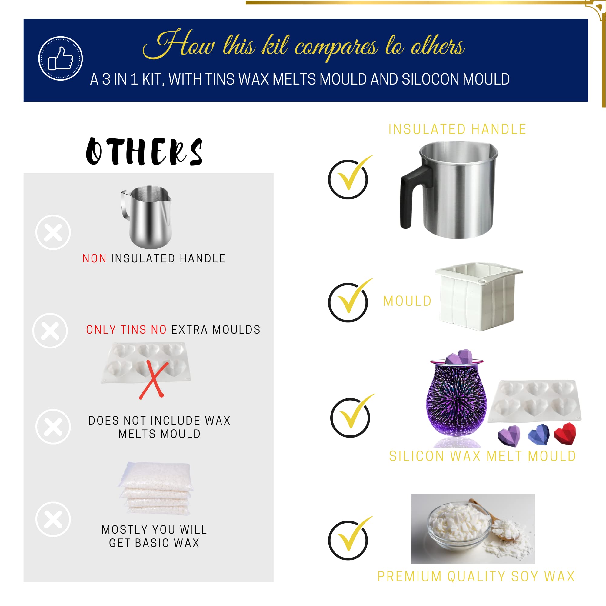 The kit includes a melting pot, 2 golden and 2 black tins, 2 lbs of natural soy wax, 100% cotton wicks, and a heart mould for making wax melts.