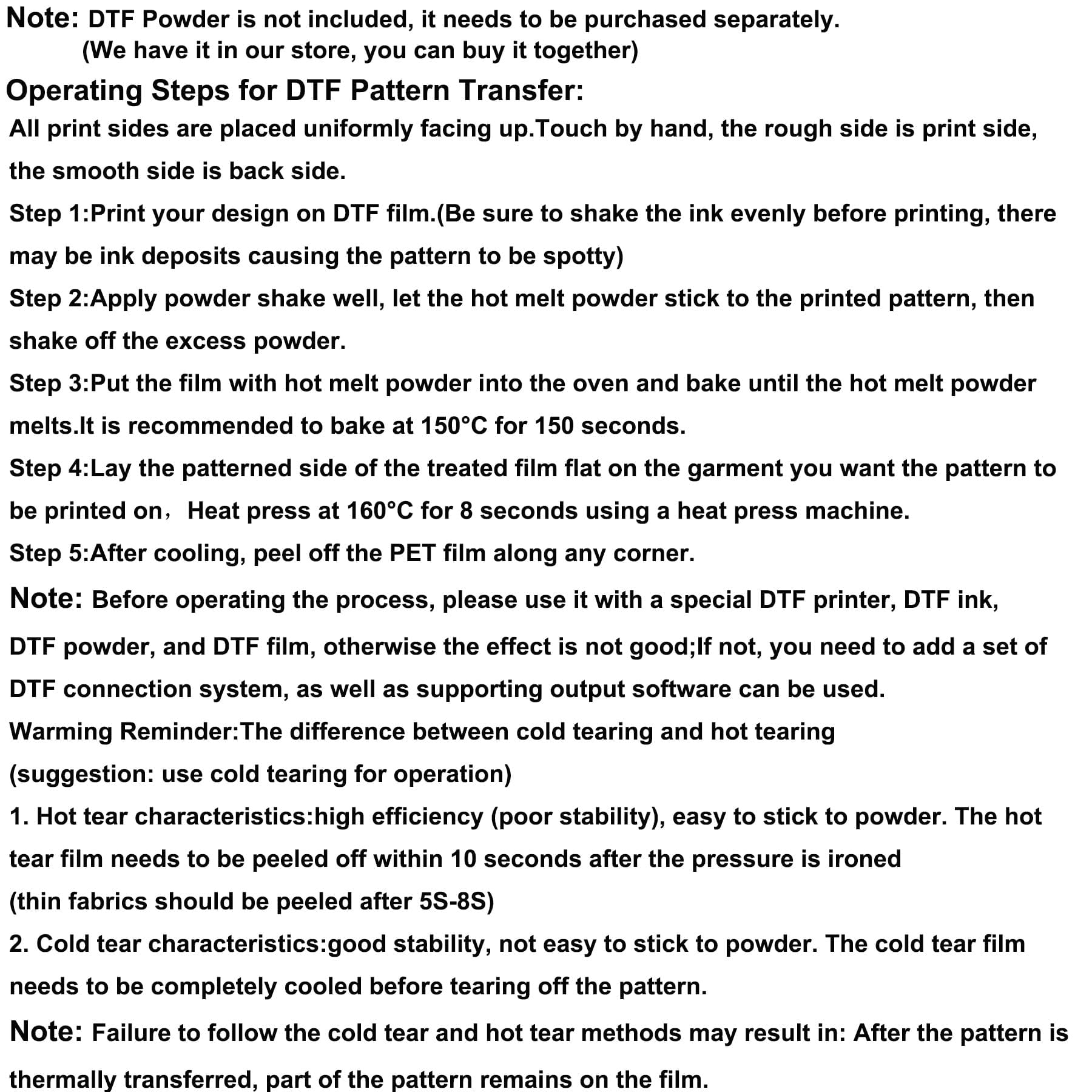 This product is perfect for crafters, small business owners, and DIY enthusiasts who want to create custom apparel and accessories. Ideal for those experienced in DTF printing, it may be less suitable for beginners who might find the handling slightly challenging. Additionally, individuals looking for a quick and straightforward transfer solution may want to consider easier alternatives.