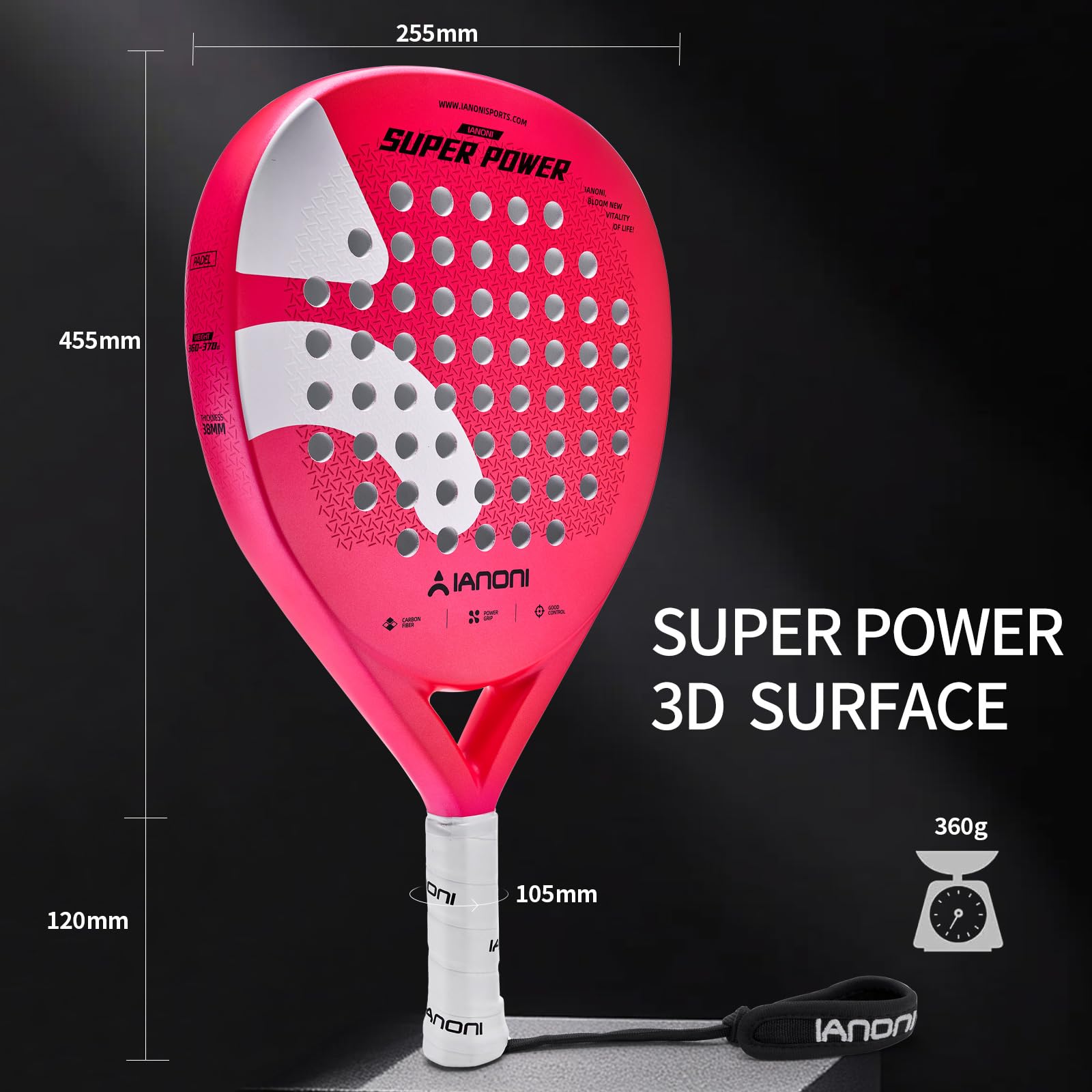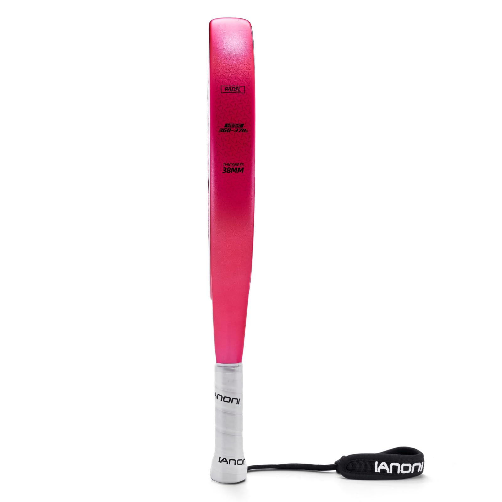 The ianoni Padel Racket weighs 360g, making it lightweight and suitable for easy maneuverability.