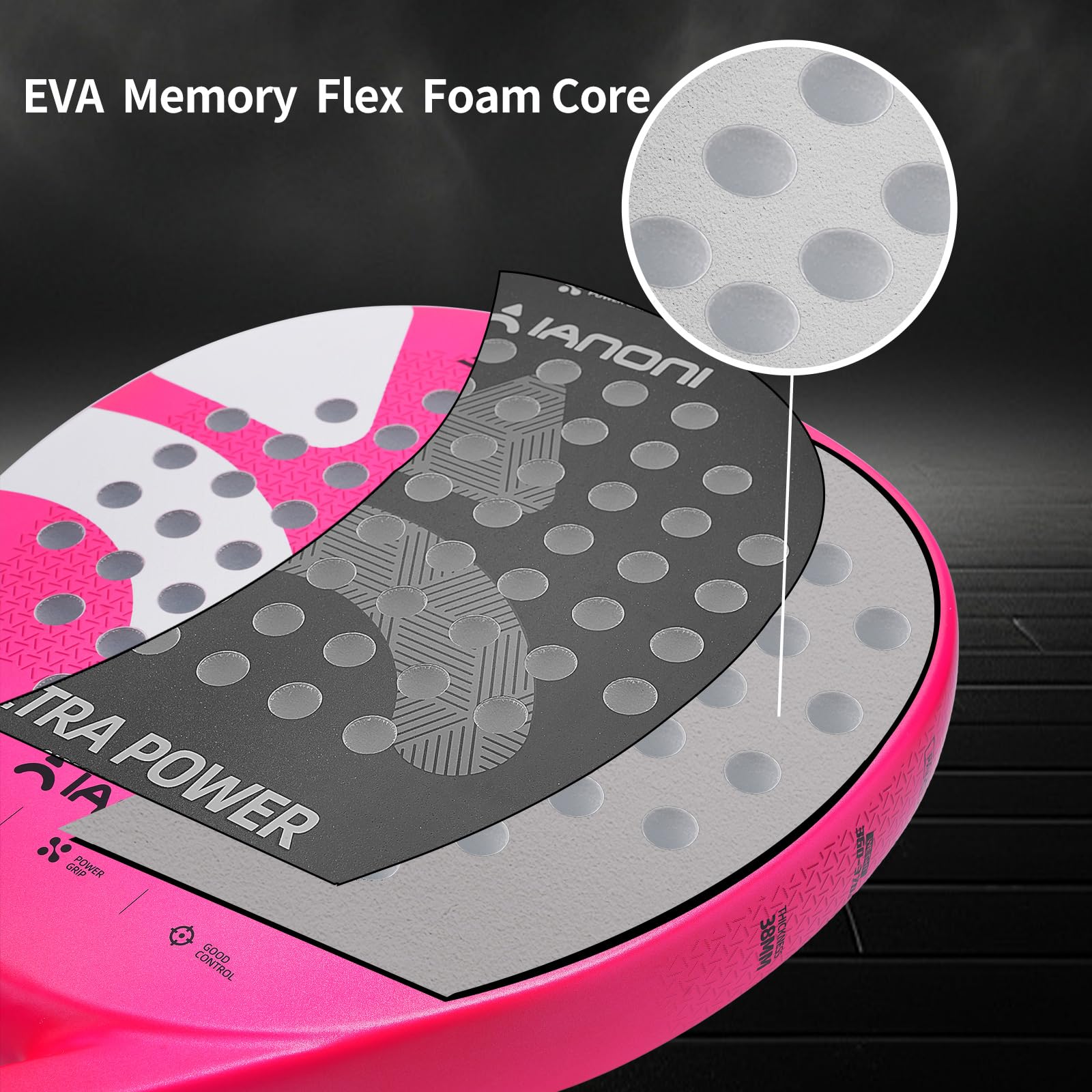 Key features of the ianoni Padel Racket include its carbon fiber face, which enhances ball control thanks to its textured surface. The racket weighs in at 360g, making it lightweight and easy to handle. The EVA Memory Foam Core is designed to provide excellent shock absorption, ensuring a comfortable playing experience. The round shape of the racket offers a balance of power and control, crucial for defensive and offensive plays alike, making it an ideal choice for players still honing their skills.