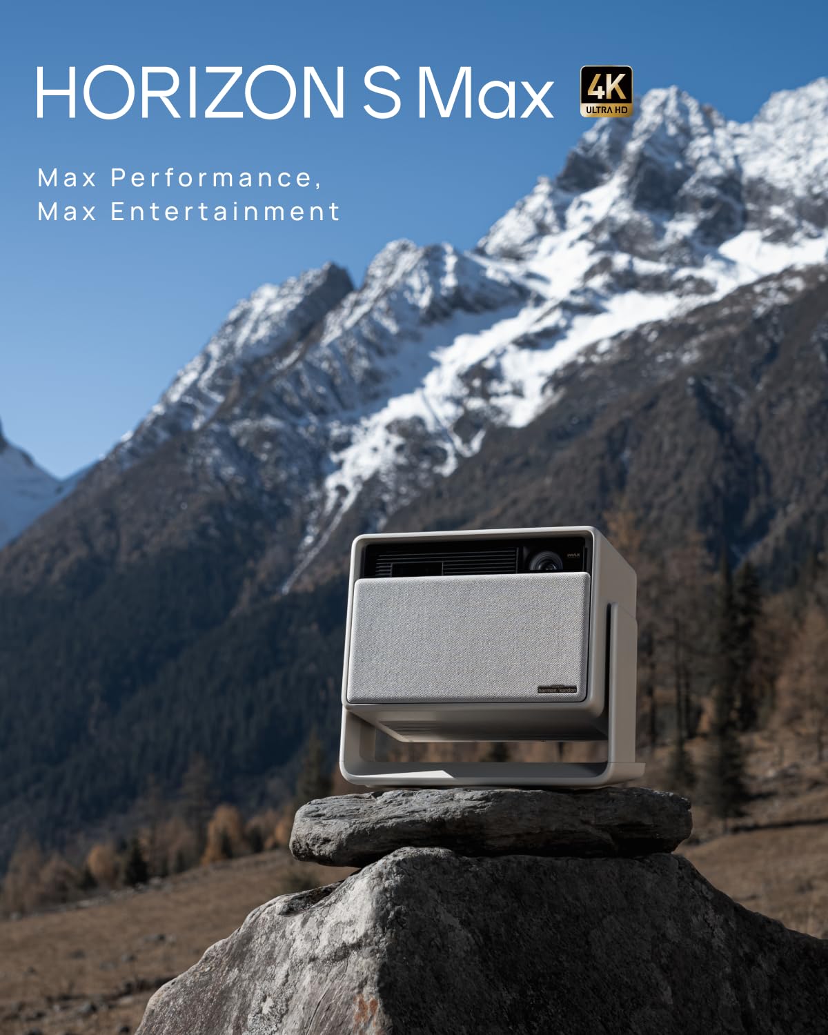The design of the HORIZON S Max is sleek and modern, fitting seamlessly into any home decor. The projector's compact size makes it portable, yet it feels sturdy enough for regular use. The two 12W Harman Kardon speakers integrated into the unit enhance audio quality, eliminating the need for external sound systems in smaller setups.