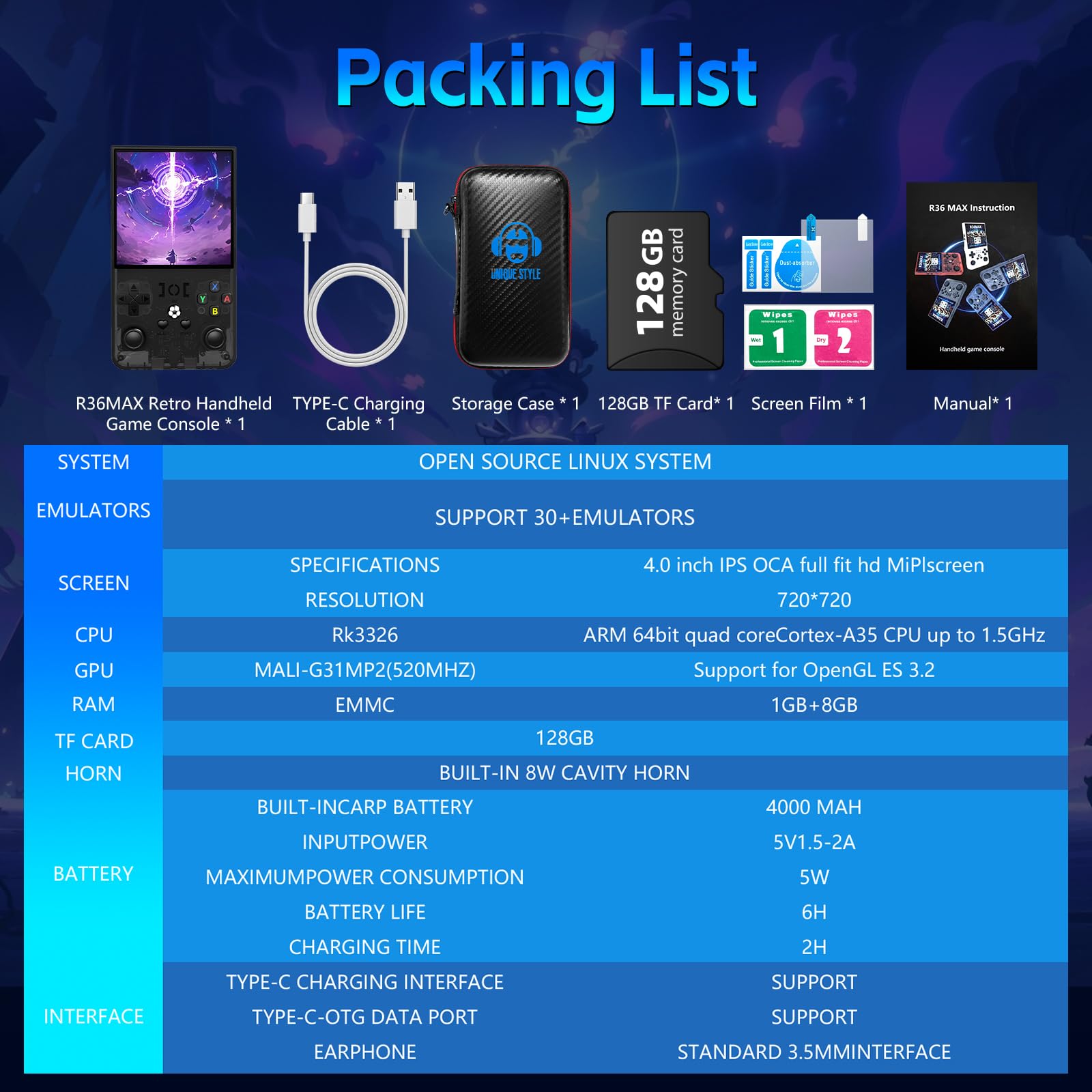 First impressions of the R36MAX Retro Games Console are striking, with its sleek black design and a comfortable grip that immediately evokes nostalgia. The 4-inch IPS display stands out, offering a 720×720 resolution that brings retro games to life with vibrant colors and excellent clarity. With over 22,000 pre-loaded classic games stored on a 128GB memory, this console promises hours of entertainment. The powerful Linux system powered by a 1.5GHz 64-bit RK3326 CPU ensures smooth performance, allowing for seamless transitions between games.