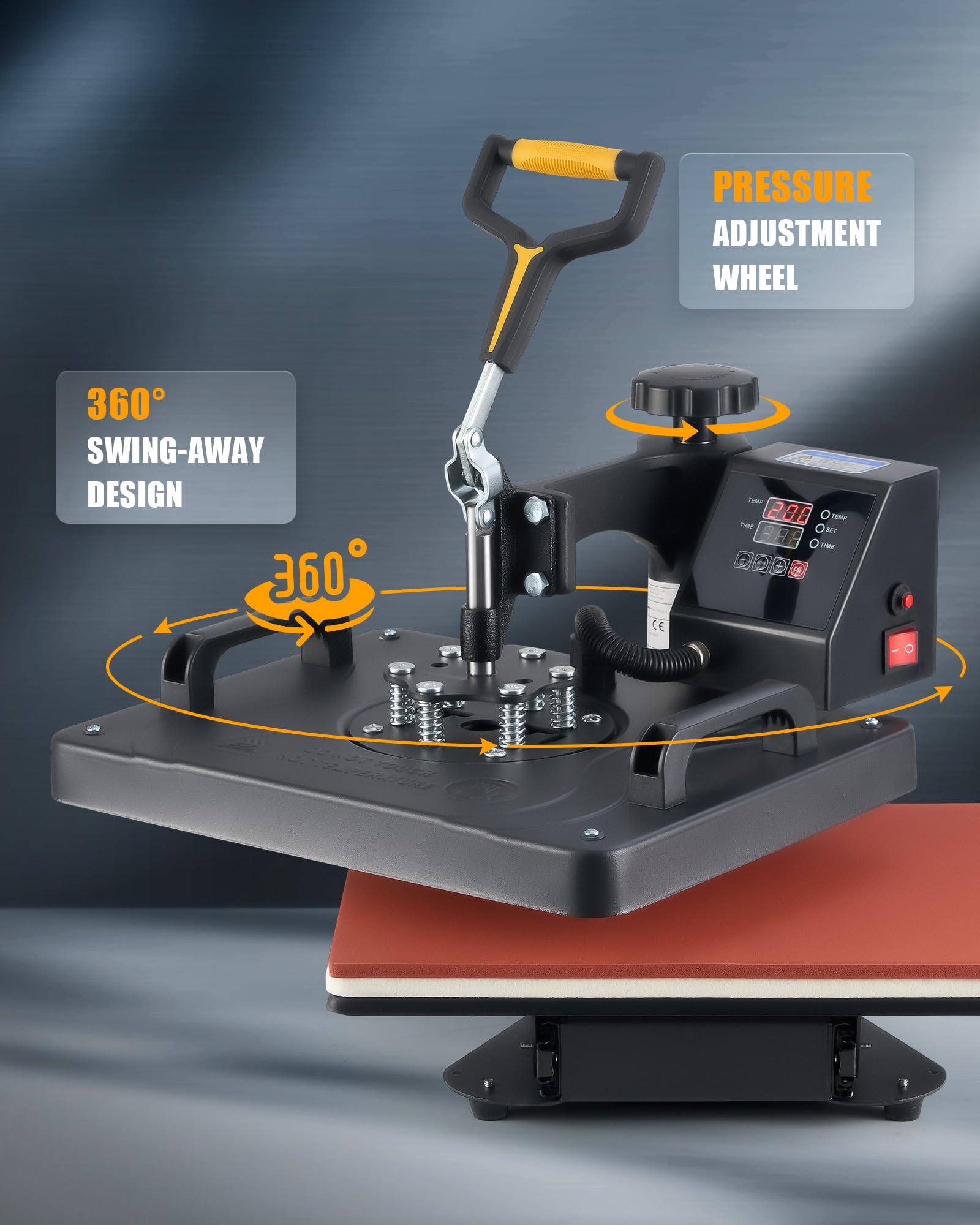 The headline appeal here is obvious: one machine, eight functions, and a 30x38cm Teflon-coated platen that gives you enough room for T-shirts, tote bags, pillow cases and other flat blanks. The swing-away design is a practical touch because it keeps your working area clearer when positioning garments, and the 360° rotation should make it easier to work safely around the platen. For makers who want a single press that can handle clothing plus accessories, the spec sheet is unusually broad for the price.