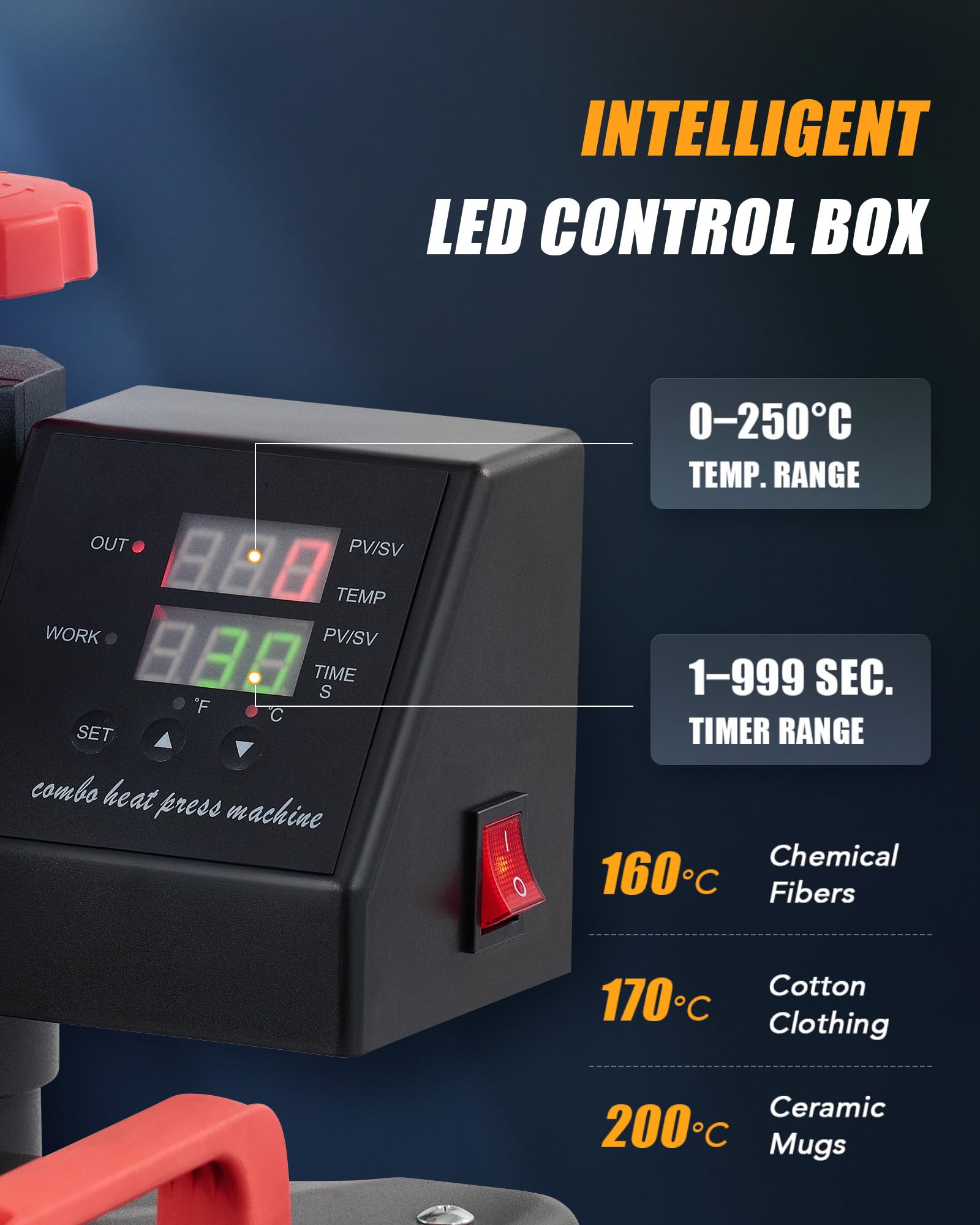 The LED control box lets you set the temperature up to **250°C/480°F**, which is enough for a wide range of common heat-transfer projects. It also supports time settings up to **999 seconds**, giving you flexibility for different materials and pressing requirements.