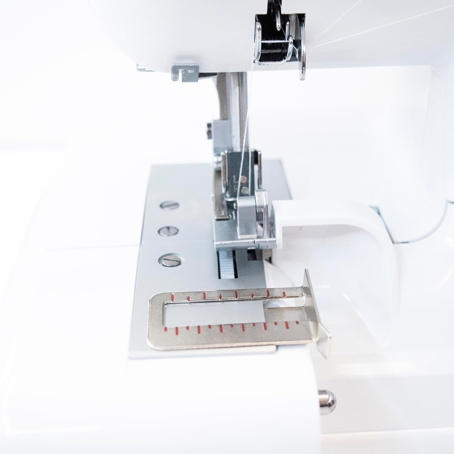 You’ll find a LED sewing light (1.0 watt) and thread cutter for day-to-day usability. There’s also a built-in needle cushion for 3-thread use and a needle threader for the top two needles—both practical touches that cut down on setup hassle.