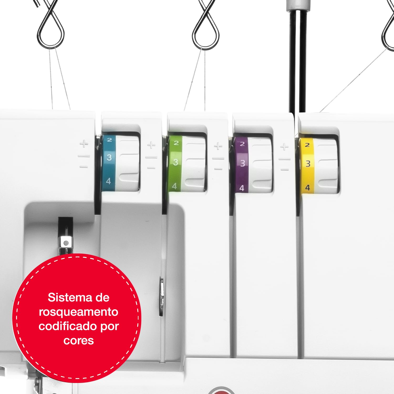 - Flexible stitch setup: 2, 3 or 4 threads and 1 or 2 needles, plus 6 stitch options including rolled hem.