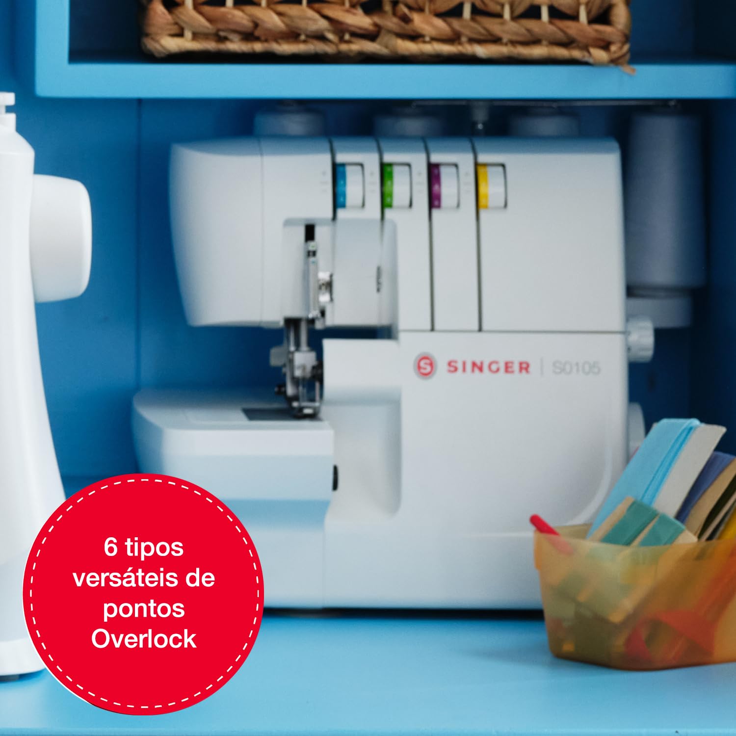 The Singer S0105 offers 2, 3 or 4-thread operation, 1 or 2 needles, and 6 different stitch options including rolled hem. That makes it useful for seam finishing, edge trimming, and decorative or functional hems on a range of fabrics.