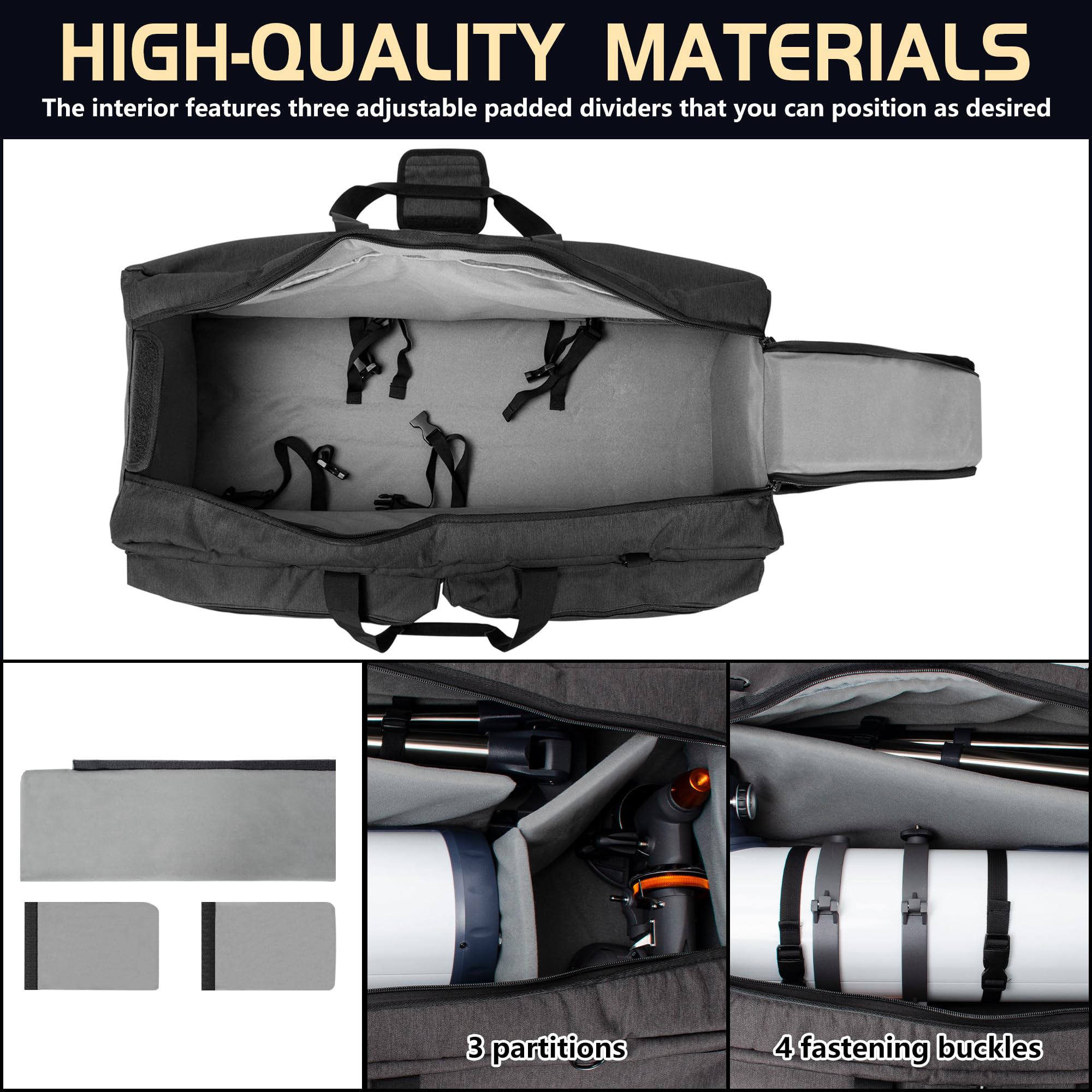 First impressions of the OUUTMEE case reveal a robust design, featuring dimensions of 30"L x 11.4"W x 10"H (76 x 30 x 25CM). The spacious main compartment is designed to fit not only the telescope but also mounts and tripods, making it versatile for various setups. The case's padded interior, along with strong buckled straps, ensures that your equipment remains stable during transport, an essential feature for protecting delicate optics.