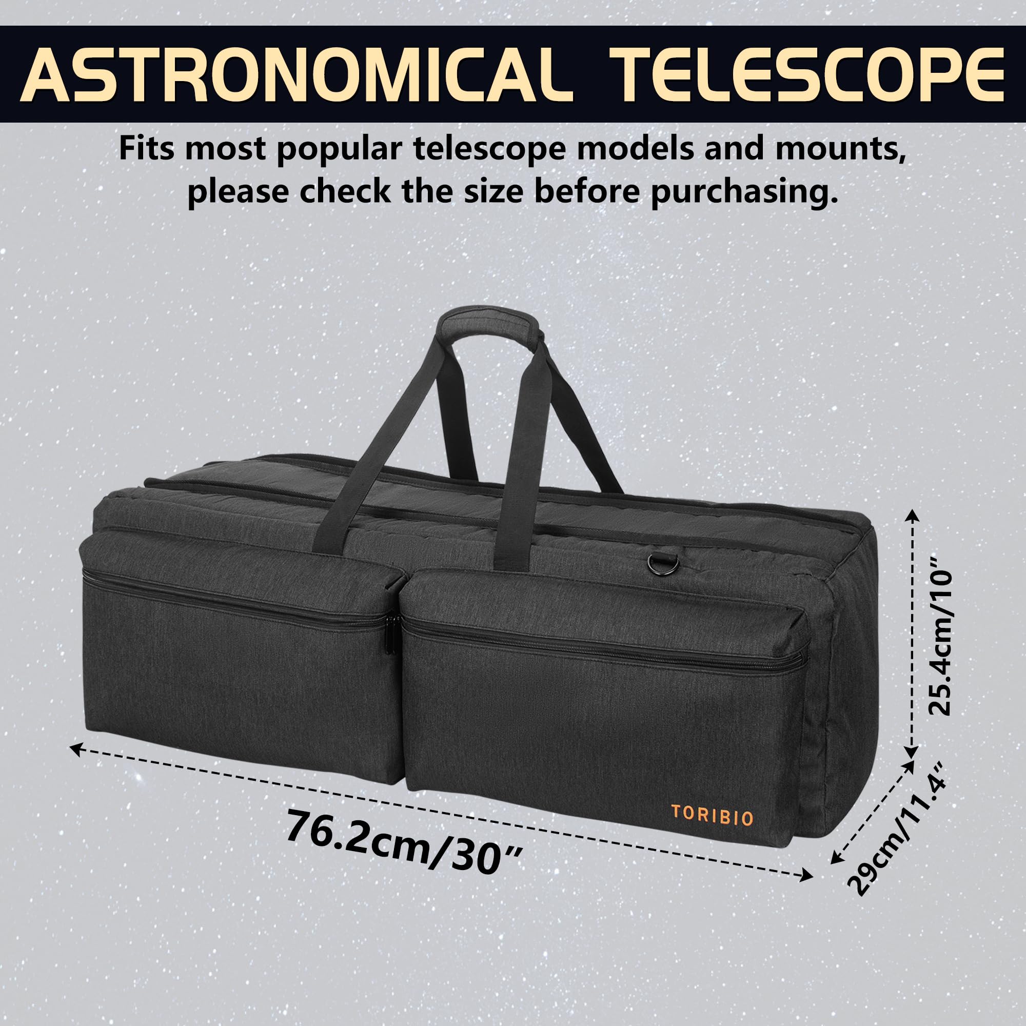 The case measures 30"L x 11.4"W x 10"H (76 x 30 x 25CM), accommodating most telescope types.
