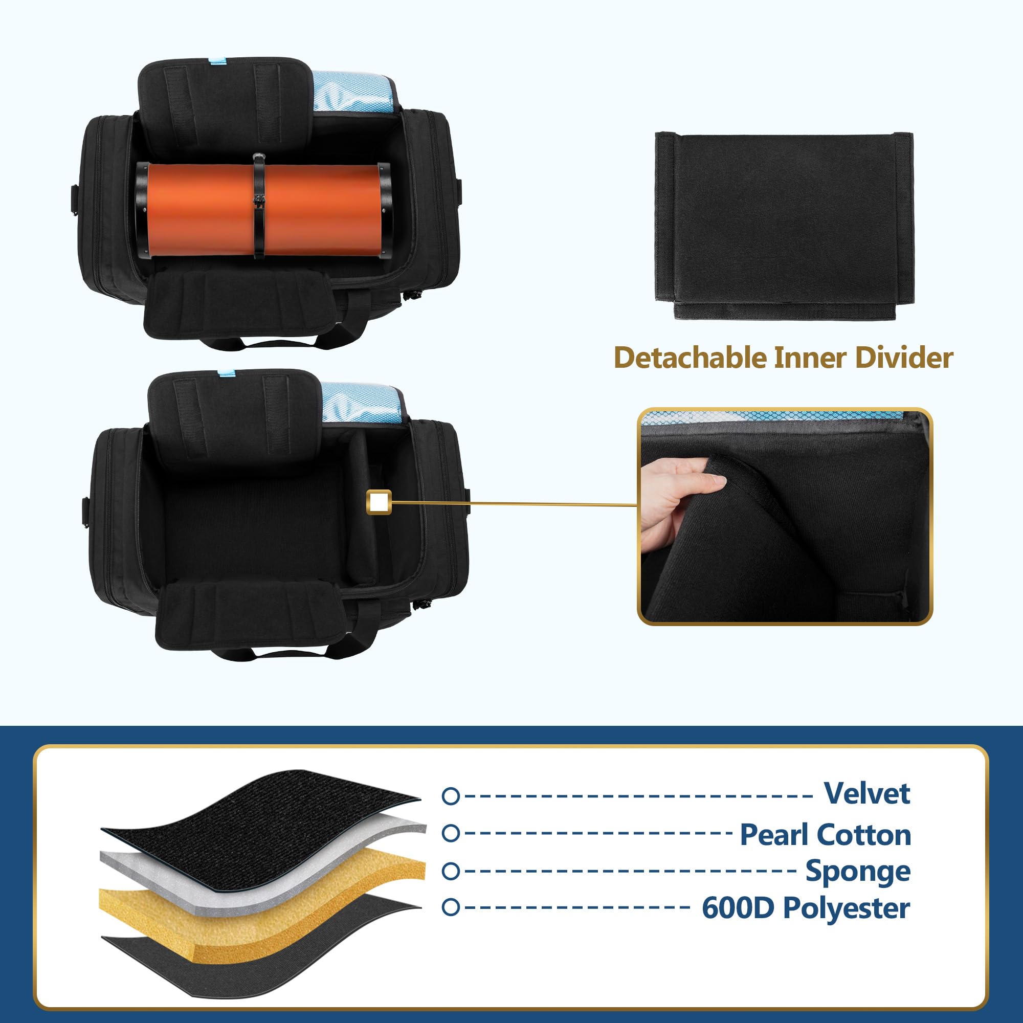 First impressions of the samdew bag are positive. It features a robust design with four layers of premium material that provides excellent protection for your telescope during travel. The detachable inner divider allows users to adjust the main compartment, ensuring a snug fit for different optical tubes. The soft protective pad wraps around the tube while a secure fastener keeps everything in place, which is crucial when transporting expensive equipment.