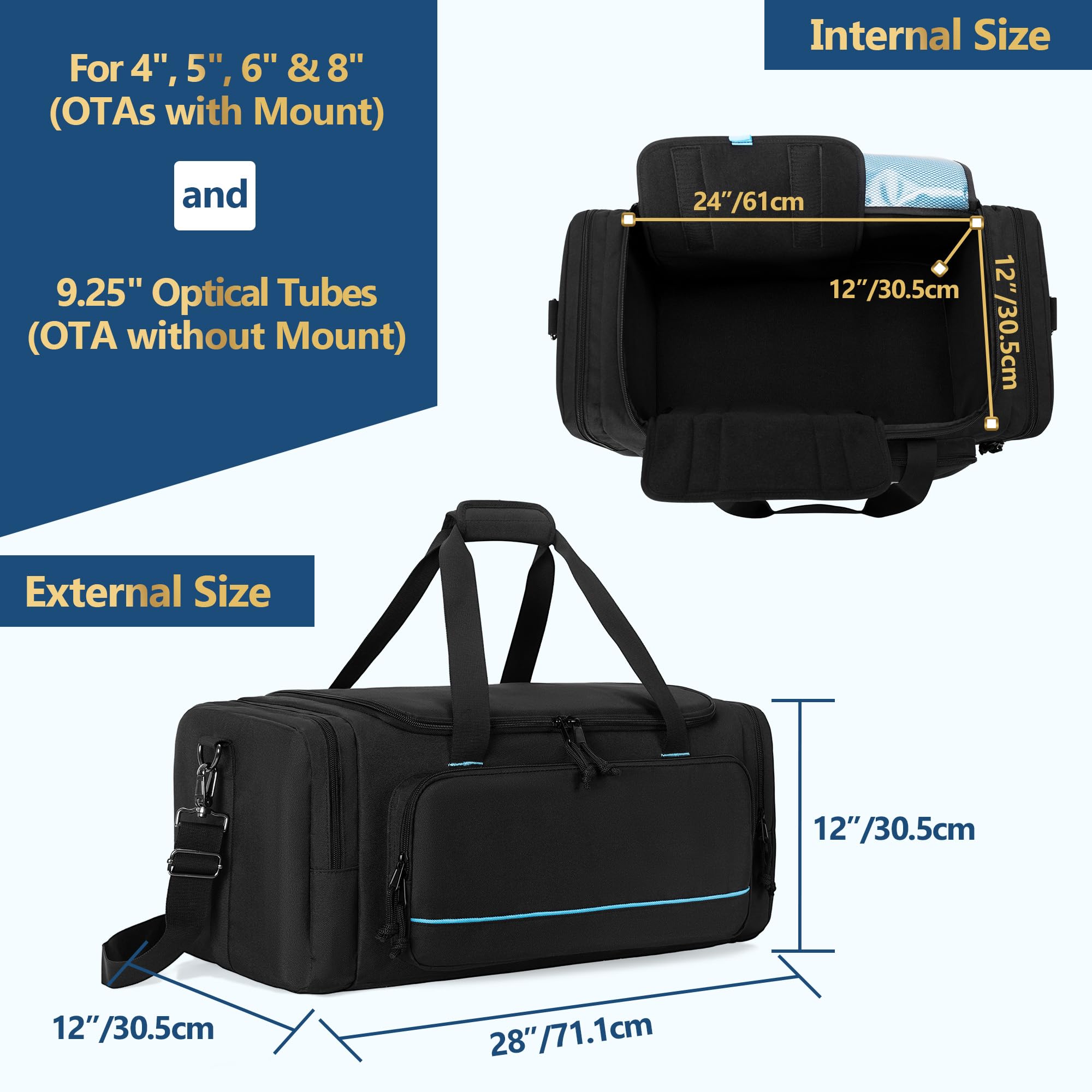 The bag's dimensions are 71.1 x 30.5 x 30.5 cm, providing ample space for your telescope. It also folds for easy storage when not in use, adding to its practicality. The inclusion of multiple pockets—such as a large zipper pocket on the front, two side zipper pockets, and a transparent zipper pocket on the top cover—enhances its functionality by allowing users to store accessories and small items conveniently.