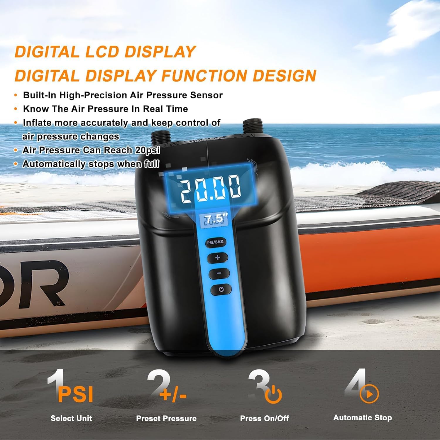 Upon unboxing, the VACHAN pump is compact and lightweight, weighing just 1.5 kg and measuring 25x17.5x15.5 cm. Its ergonomic handle makes it easy to carry, which is a significant advantage for those trekking to the water's edge. The digital LCD screen displays real-time pressure readings, allowing you to monitor the inflation process effortlessly.