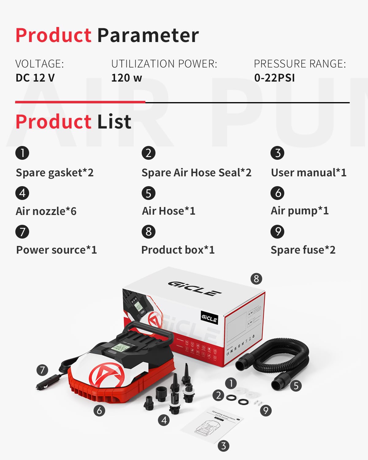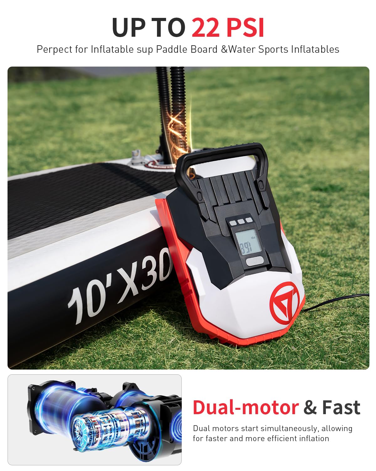 The GICLE Paddle Board Pump can achieve a maximum pressure of 22 PSI, suitable for most inflatable paddleboards and boats.