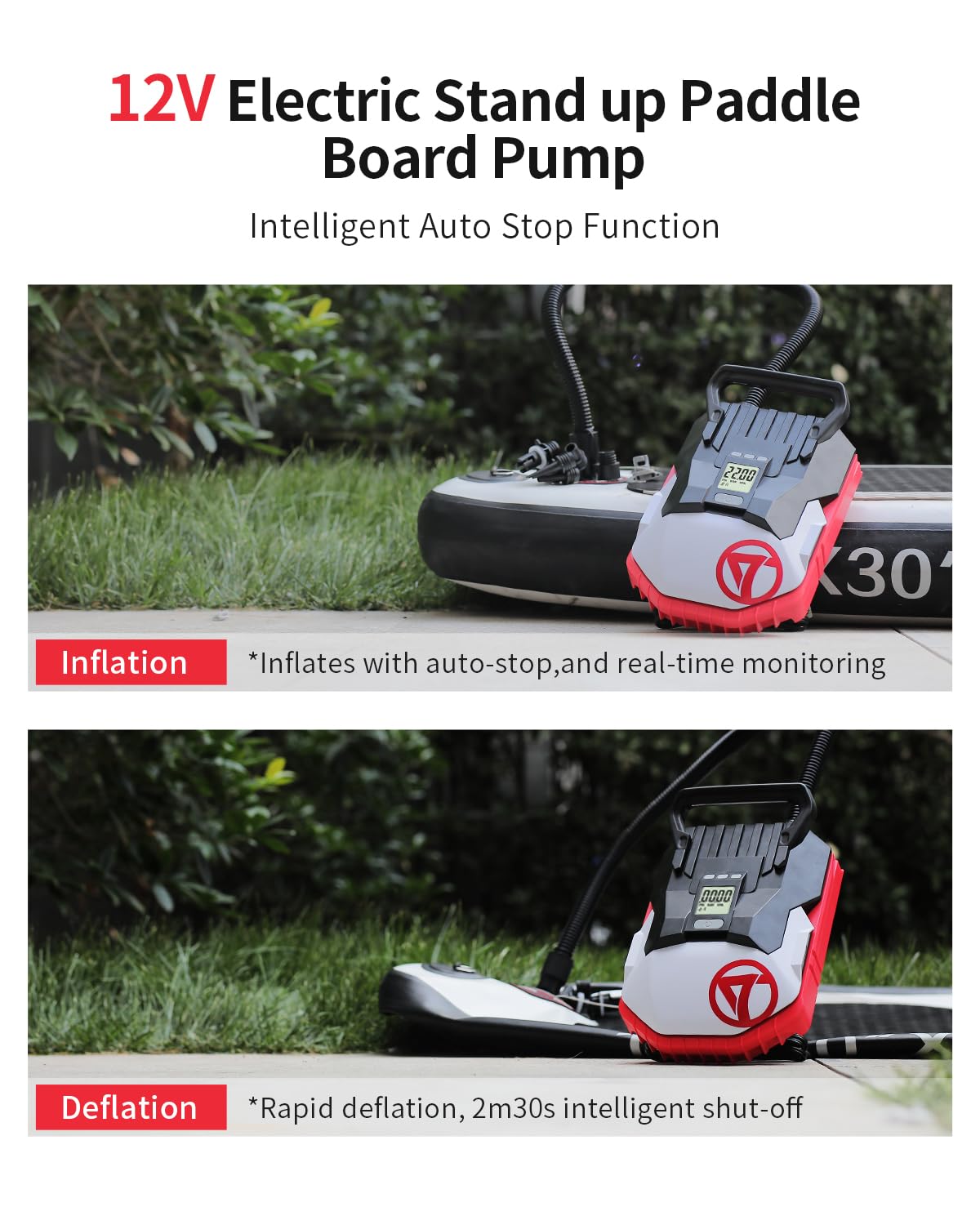The GICLE Paddle Board Pump features a dual-stage inflation system. The first stage operates at a rapid 400 liters per minute for quick inflation, while the second stage ensures maximum pressure up to 22 PSI, ideal for various inflatable items such as paddleboards, boats, and tents. The intelligent control system automatically stops when the set pressure is achieved, providing peace of mind during use.