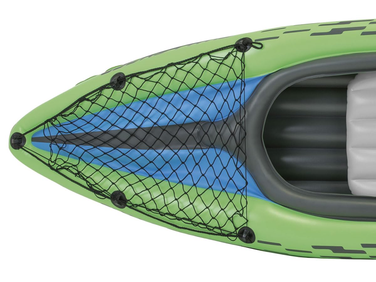 The Intex Challenger K1 is constructed from a durable "super-tough" vinyl that is resistant to gasoline, oil, and saltwater. This high molecular PVC material enhances the kayak's resilience against abrasions, impacts, and UV damage, which is crucial for long-term use in variable UK weather conditions. The kayak includes 84" aluminium oars, which are lightweight yet sturdy, and a high-output hand pump for quick inflation. The design features inflatable seats with backrests and an I-beam floor for added stability.