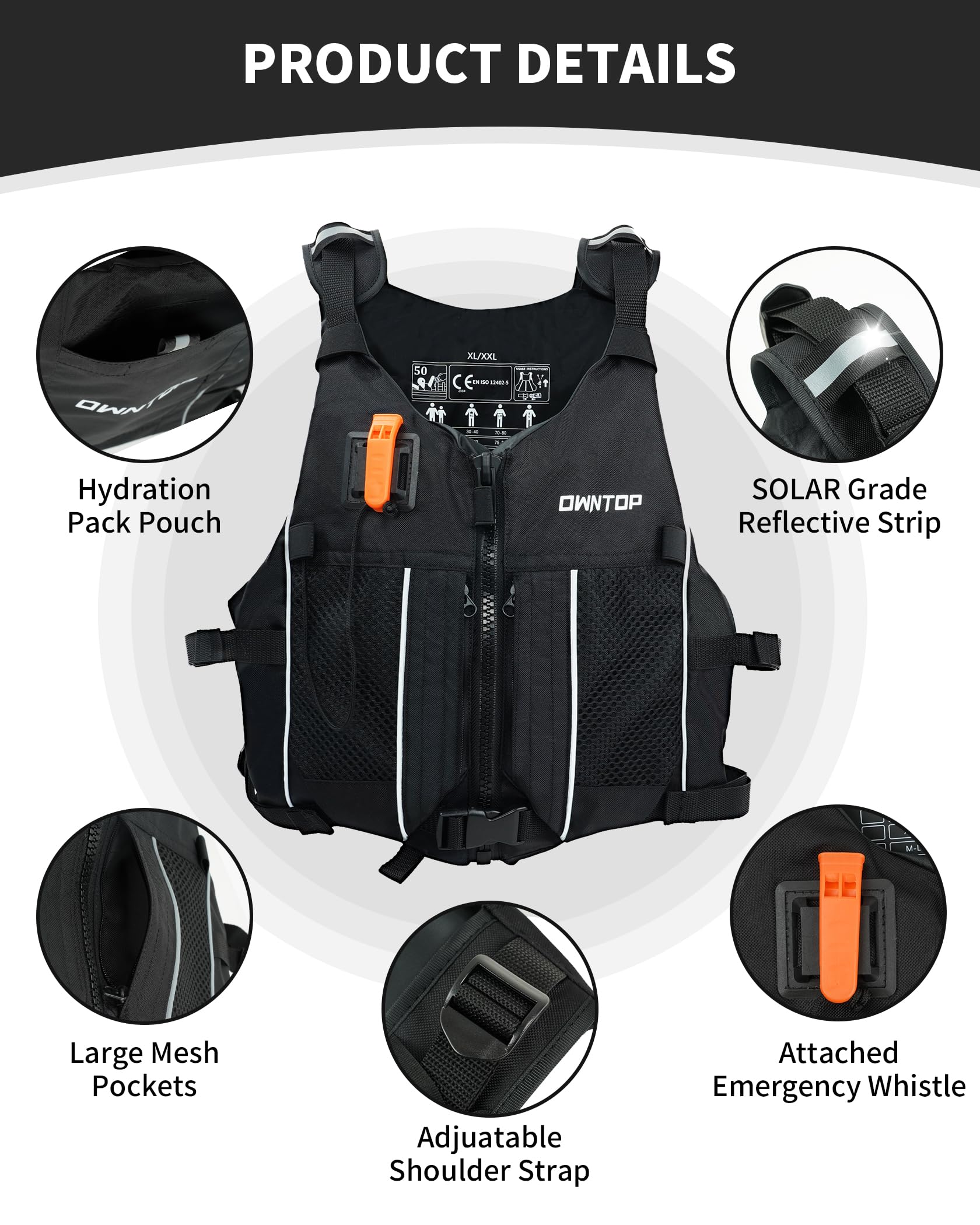 The big draw here is the 2-in-1 design. Owntop has built this as more than just a flotation aid: you get a dedicated hydration pack pouch, two large mesh pockets, reflective shoulder-strip detailing, and an emergency whistle. That combination makes sense for longer sessions on UK canals, estuaries, and inland waters where you may be out for hours and need water, snacks, or small essentials close at hand.